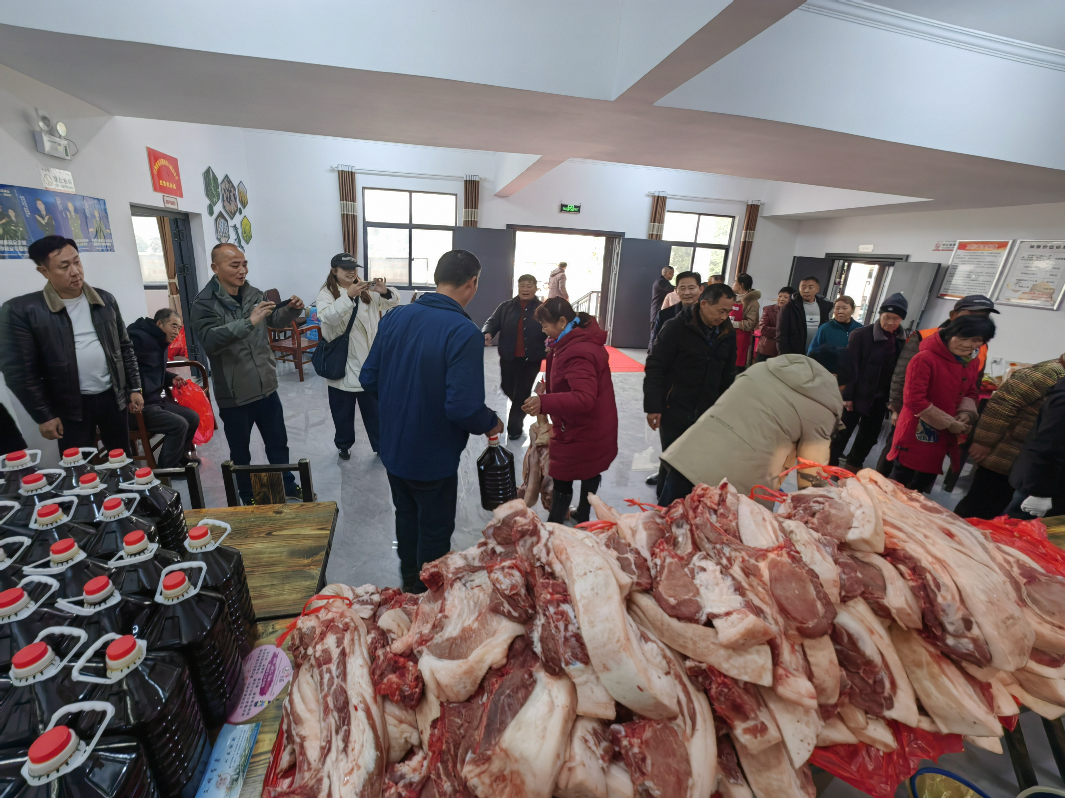 大厅里的长条桌上,一刀刀剁好的新鲜猪肉堆成小山,一袋袋自己种的生态米装成包,一提提喷香的菜籽油摆放整齐,村民们早早排成长队,开心地签字领钱领米领肉。“真是没想到我能分到这么多红利,我每周开车回来打扫卫生,顺便将社区朋友们订的土鸡和鸡蛋带回温泉城区。”村民涂冬仁说。