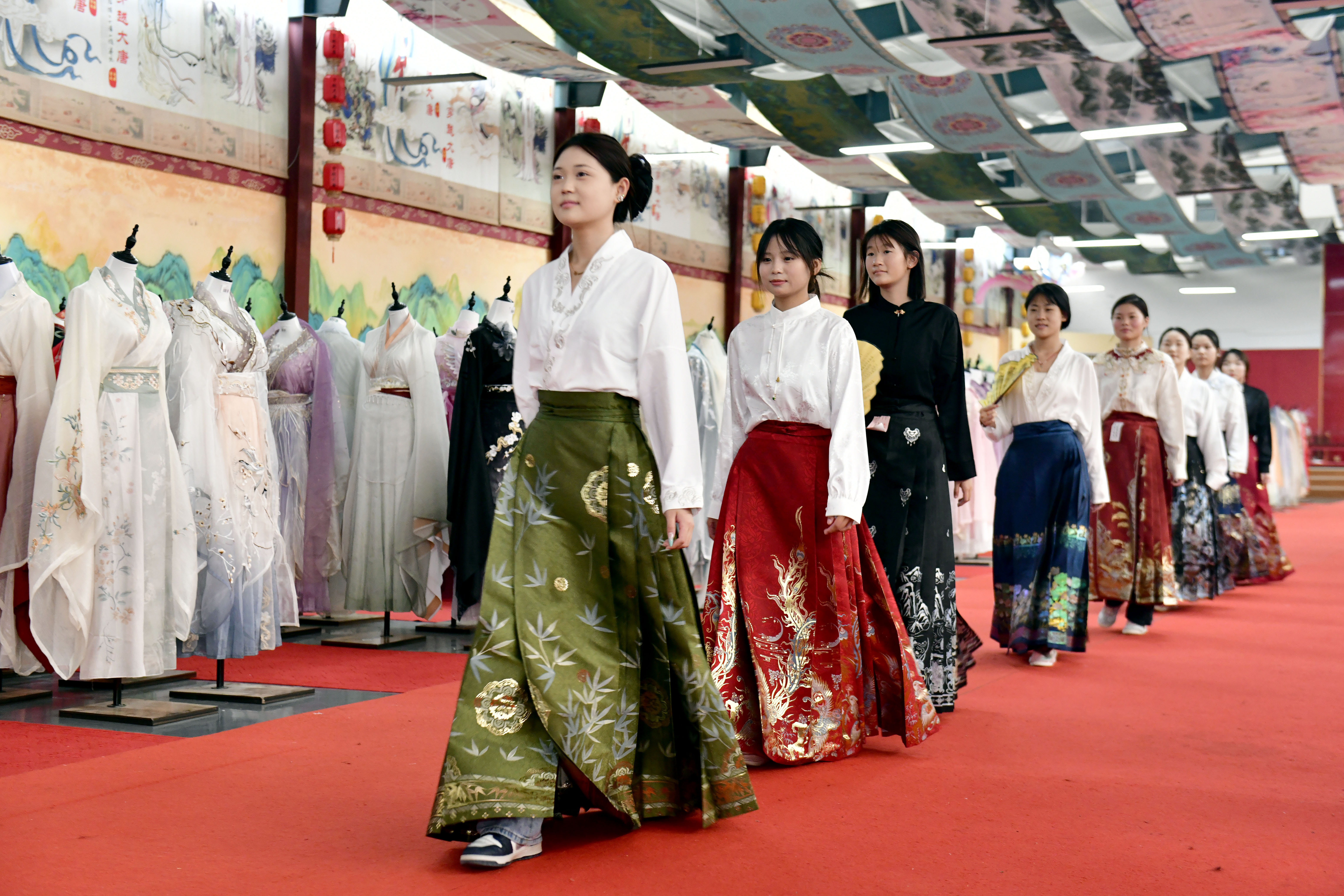 暗纹妆花织金缎马面裙、方襟盘扣长裙、灵芝环纹提花短袄……杭州环北丝绸服装城内,各式新中式服饰汇集。