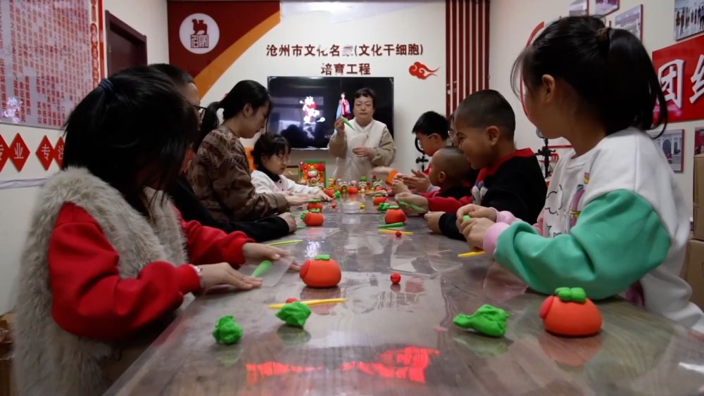 春节期间,在河北省沧州市新华区文化名家工作室,非物质文化遗产代表性传承人张英英为附近居民传授捏面人技艺。