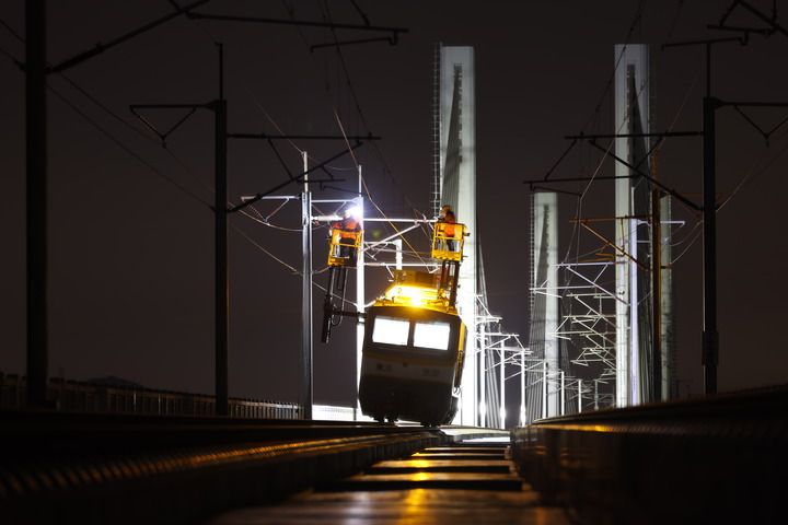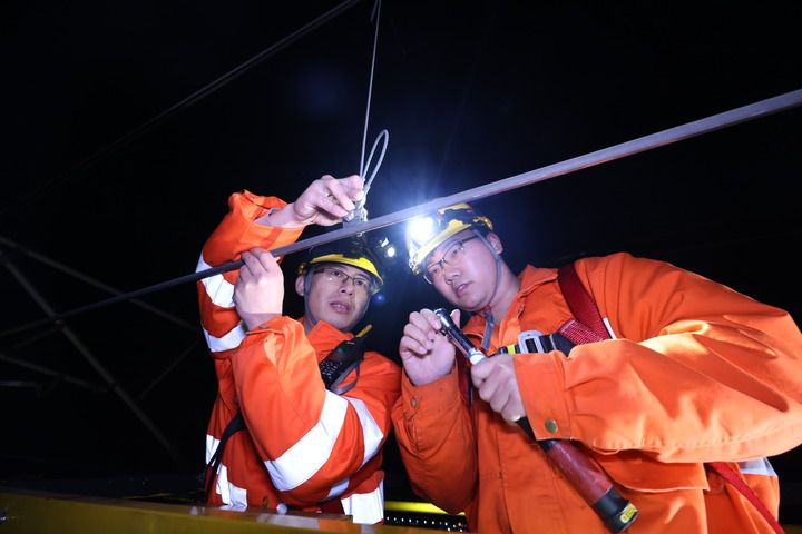 凌晨1点,在福厦高铁湄洲湾跨海大桥上福州供电段莆田高铁供电工区的接触网工们在检查接触网供电设备。徐亮摄