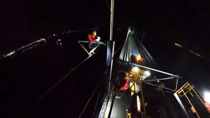 这一次,许冲的徒弟王世东负责检查最难攀登的外侧供电线路。外侧供电线路悬在桥外,王世东需要在高空“走钢丝”。他每挪动一步,下方的许冲就大声提示他接下来的最优“落脚点”。