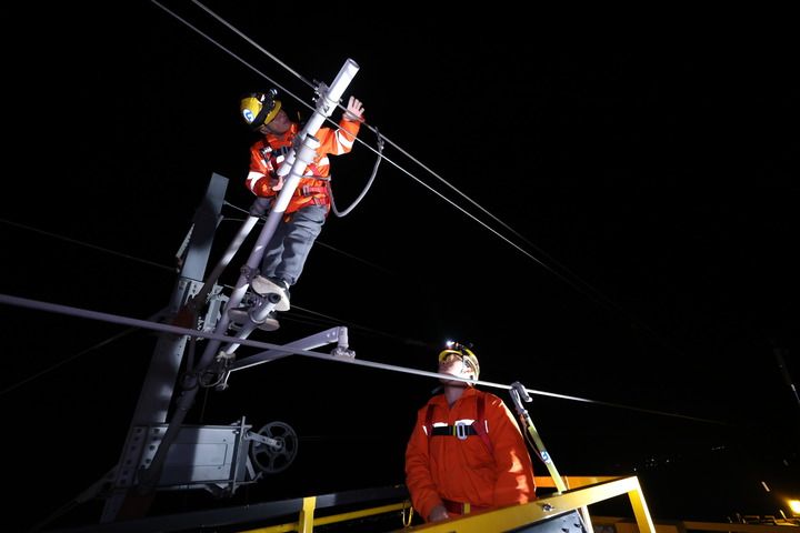 作业人员在检查接触网整力索状态。胡鹏摄