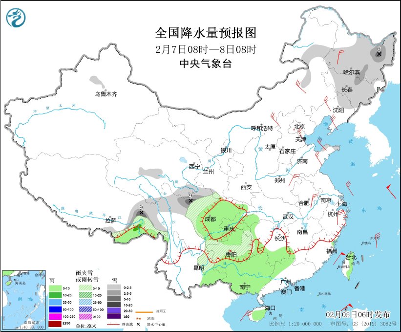 2月7日08时至8日08时,内蒙古东北部、东北地区中北部、西藏东部、川西高原、贵州中南部和西部等地部分地区有小到中雪或雨夹雪,其中,黑龙江东北部、西藏东部、川西高原北部等地局地有大雪(5~9毫米)。西藏东南部、湖南南部、西南地区东部、云南东南部、华南西部和北部等地部分地区有小到中雨。内蒙古中东部、黑龙江西部、辽宁、山东半岛、江淮中西部、江南东北部等地部分地区有4~6级风)。