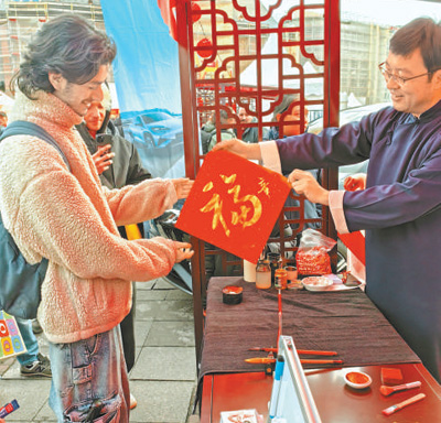 活动现场的非遗手工艺品和美食区也吸引了大量当地民众参与,传统手工艺糖画、毛笔书法体验展位前更是排起了长龙。当地民众伊尔迪兹排队很久终于如愿领取礼品,他饶有兴致地观看现场工作人员写下金色的“福”字,还特别要求加上他姓氏的中文译名。“这是我第一次逛春节庙会,这里热闹红火,还有美食和礼品,向所有人开放,非常新奇,富有创意。如果有机会,我希望亲自去中国走走看看!”伊尔迪兹说。