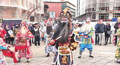 来自广东汕头潮阳的西门英歌队一出场就将现场气氛推向高潮。演员们双手各持一根短木棒,配合节奏,上下左右对击。传统脸谱色彩鲜明,表演服饰华丽亮眼,“男女英歌斗舞”令人目不暇接,整体呈现出强烈的力量感和蓬勃朝气。一位德国观众对记者表示:“这是我第一次看到中国的春节民俗表演,它有着和德国节日类似的巡游形式,但却有自身的特色,非常有趣。”