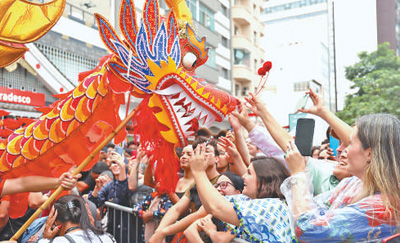 2月1日,巴西圣保罗市中心的自由广场上人头攒动、摩肩接踵,一场盛大的“欢乐春节”游园会正在这里举办。广场一侧搭建的舞台上,两侧“蛇舞九州山河美,春临四海天地新”的楹联烘托起蛇年新春的喜庆氛围。