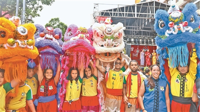 不远处,由巴西青年组成的舞龙队、舞狮队伴着铿锵的鼓点前进,广场上旌旗飘扬,与各色的舞狮、节日服饰汇聚成色彩缤纷的海洋,现场观众纷纷拿出手机拍照录像,或是和舞龙、舞狮“亲密互动”。舞台上,中国功夫、中国舞蹈轮番上演,引得现场观众掌声连连。