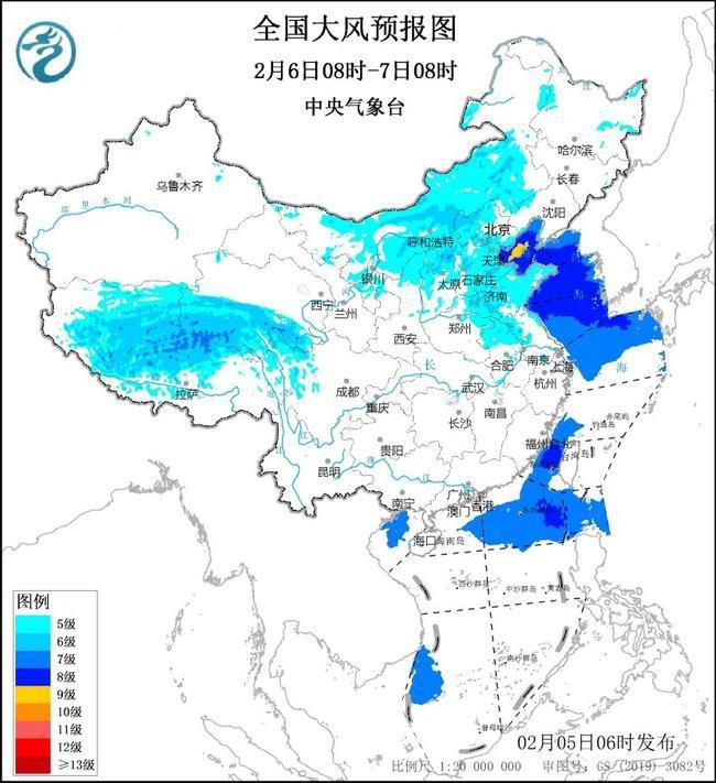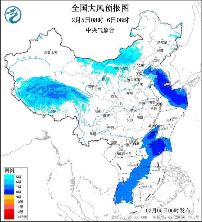 预计,2月5日8时至6日8时,西藏中北部、青海南部、内蒙古中西部、华北北部等地部分地区有5~6级、阵风7~8级的大风,其中,西藏中北部、青海西南部的部分地区风力可达6~8级、阵风9~11级;渤海、渤海海峡、黄海大部海域、东海北部海域、台湾海峡、巴士海峡、南海东部和西南部海域将有7~8级、阵风9~10级的大风,其中黄海东南部的部分海域风力可达9级、阵风10级。
