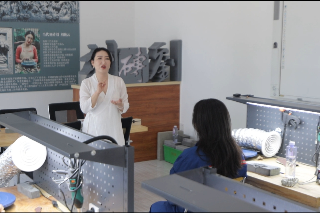 “刻砖刘”的始祖是清代道光年间的马顺清,其外孙刘凤鸣是天津第一代专业砖雕工匠。作为天津市非物质文化遗产“刻砖刘”砖雕技艺第五代传承人,刘季赟(刘挽云)自出生便与砖雕结下不解之缘。“小时候其他孩子玩玩具、看小人书,我就捏泥巴、钻研爷爷的古建图纸,所以走‘刻砖刘’的传承之路对我而言是必然的。”忆起往昔,她的眼中闪烁着坚定与热爱。