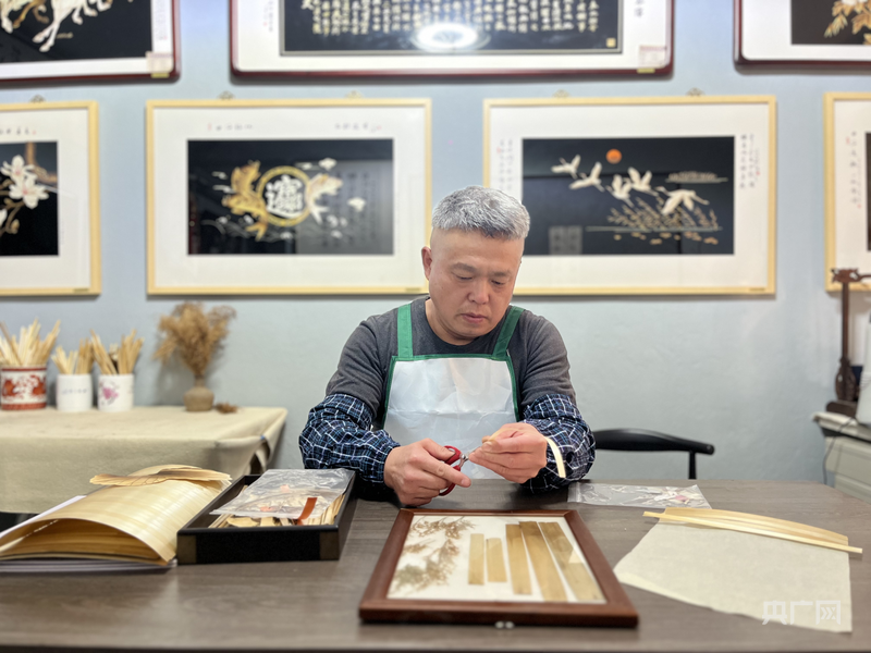 田宝军展示芦苇画制作技艺(央广网记者 褚夫晴 摄)