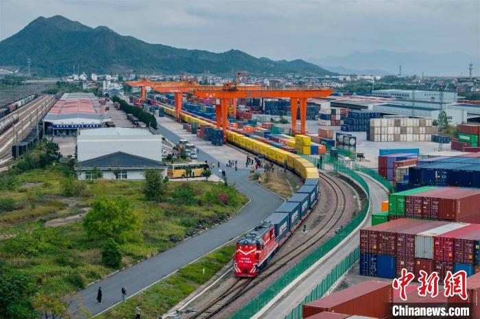 一列浙江中欧班列从铁路金华南站货场驶出。胡肖飞摄