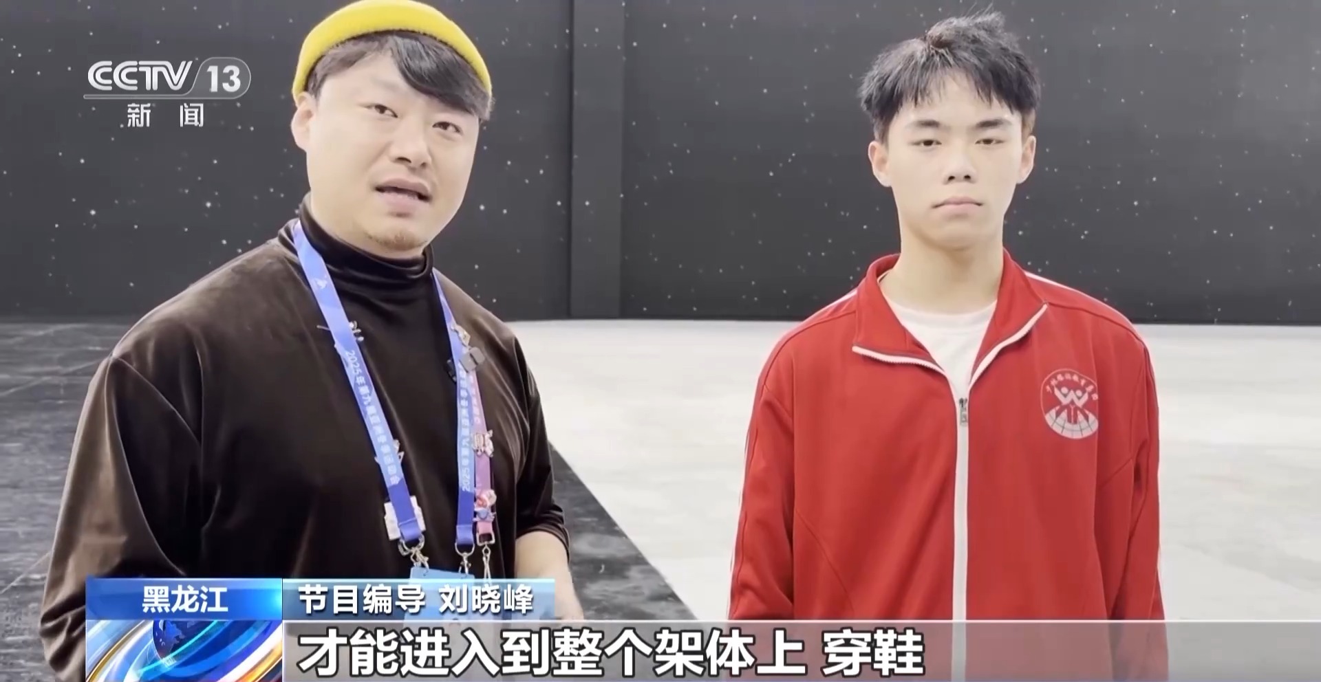 节目编导刘晓峰:(节目)主要是讲运动员竞技的那种力量,整个的立意是把体育的精神、力量、对抗,经过了很多的打磨,用了三个月的时间,先是体能训练,腹部、腰部、腿部的训练,才能进入到整个架体上,穿鞋。他这个铁鞋一拆一卸也是经过了百次上千次的这种练习才能达到现在的效果。