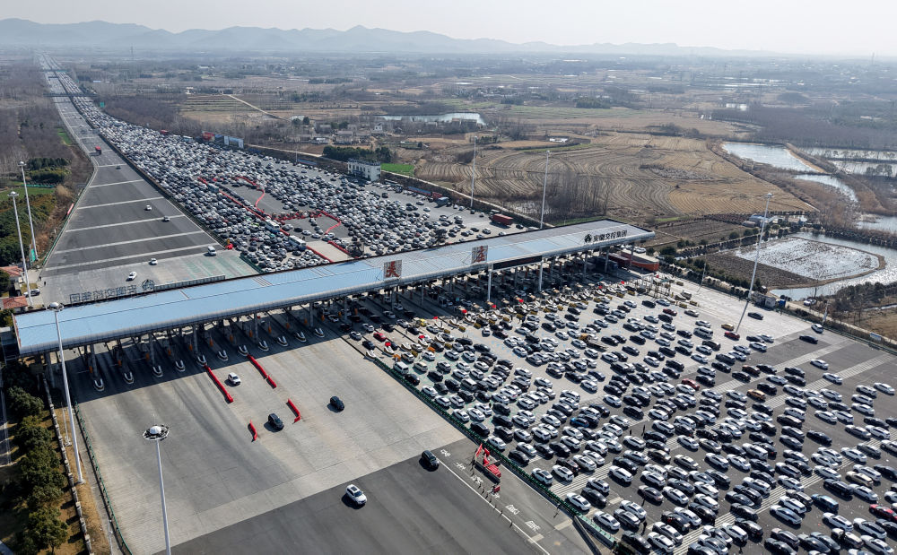 2025年2月4日,节后返程车辆通过合宁高速公路吴庄收费站(无人机照片)。新华社发(沈果 摄)