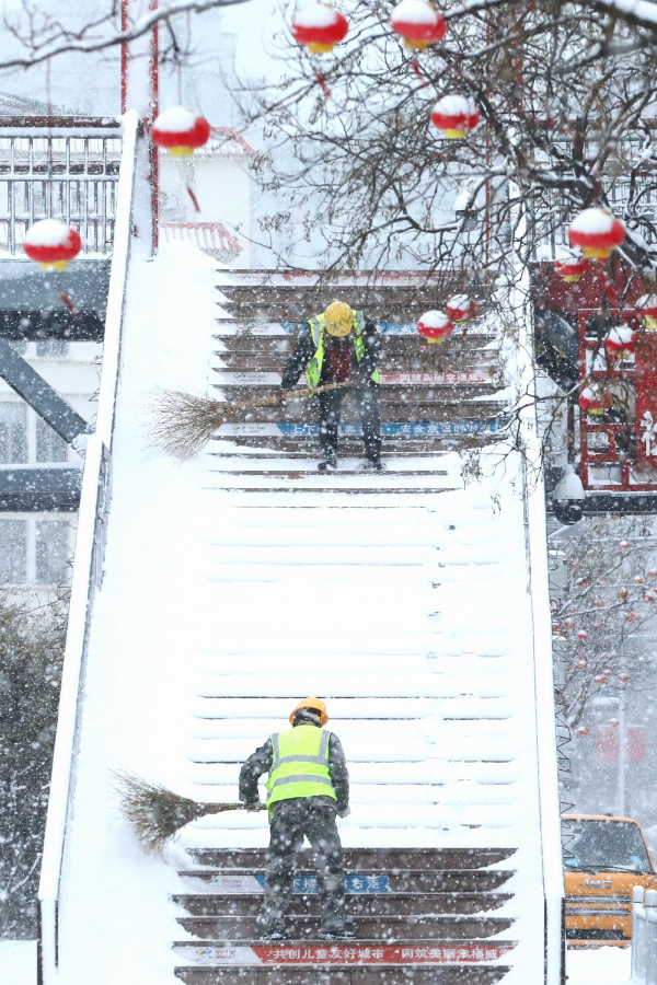 2025年1月28日,在山东省威海市环翠区,市政工人冒雪清扫过街天桥积雪。新华社发(刘中华 摄)