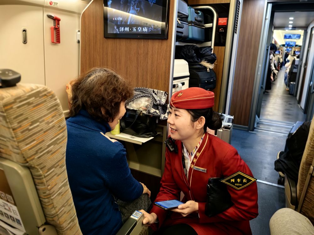 2025年1月25日,在北京开往上海的G9次列车上,列车长韩茹为一位独自出行的老年旅客服务。新华社记者 翟翔 摄
