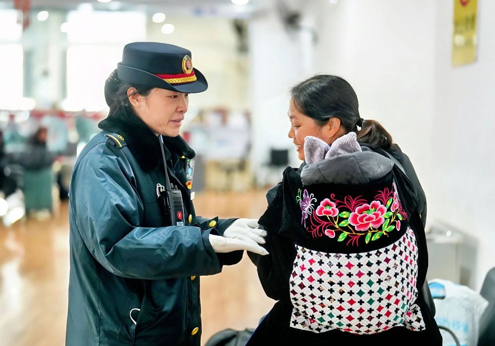 2025年1月29日,国铁武汉局襄阳站客运员穆佟在为旅客服务。新华社发(刘娟 摄)