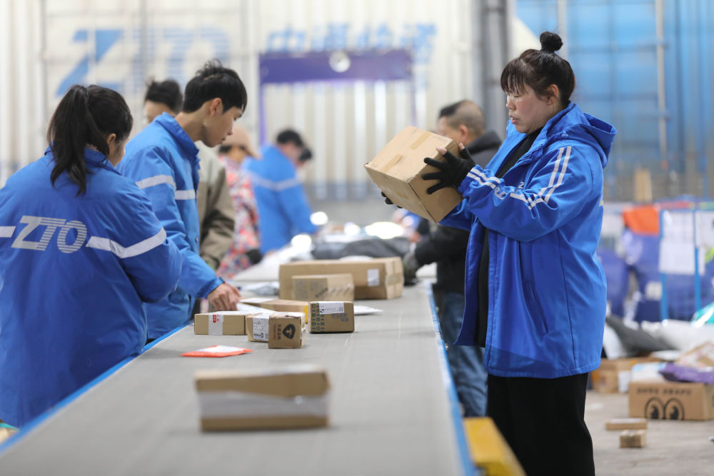 2025年1月30日,工人在湖南省永州市道县中通快递分拣中心分拣快递件。新华社发(何红福 摄)