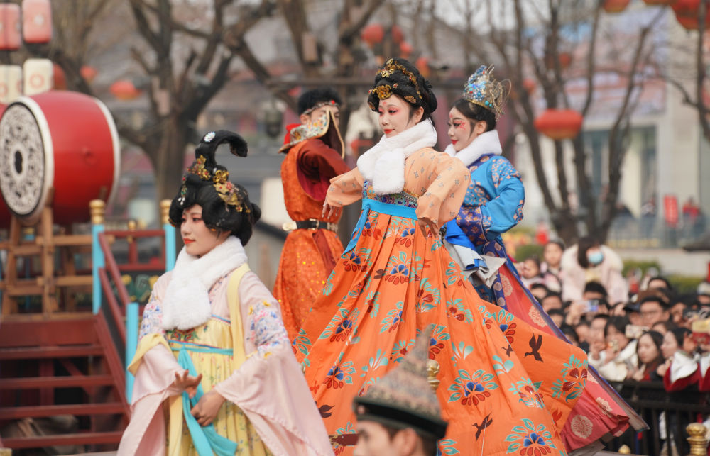 2025年1月31日,游客在陕西西安大唐不夜城景区观看以唐代历史文化为背景创作的舞剧。新华社记者 邵瑞 摄