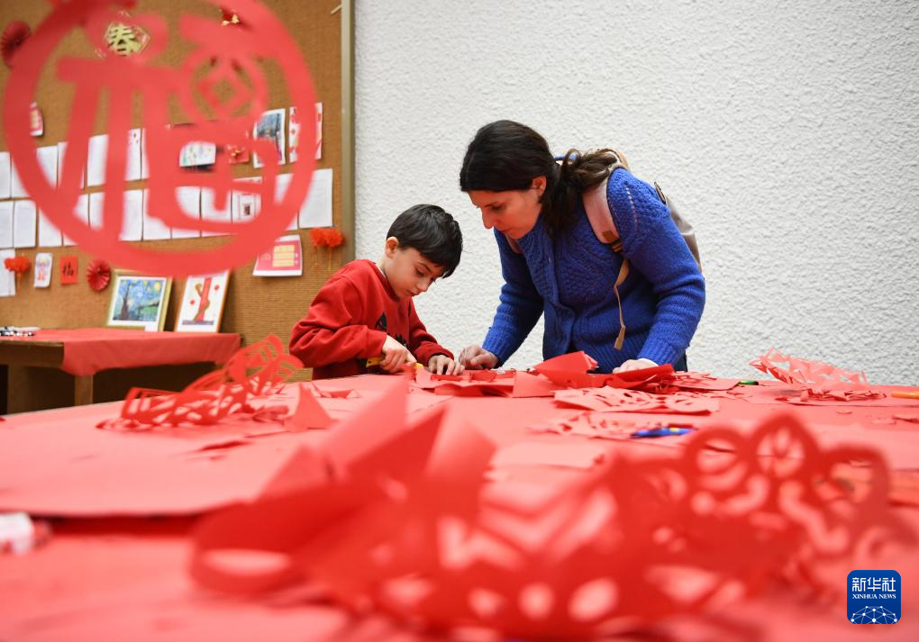 2月9日,在瑞士日内瓦,日内瓦中文学校的学生家长在2025蛇年春节联欢会上带孩子体验中国剪纸。 新华社记者 连漪 摄