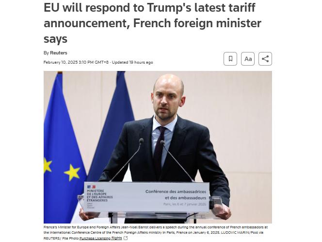 据路透社报道,当地时间10日,法国外交部长让-诺埃尔·巴罗表示,欧盟将就美国对其加征的最新关税声明进行反制。