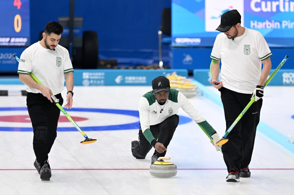 2月10日,沙特冰壶队选手侯赛因·哈加维(右)在比赛中。新华社记者 郑焕松 摄