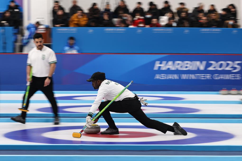 在2月9日进行的亚冬会冰壶男子循环赛B组第四轮沙特队与中国队的比赛中,沙特队选手侯赛因·哈加维(中)掷壶。新华社记者 赵子硕 摄