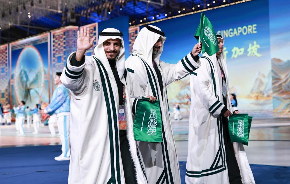 2月7日,沙特代表团在哈尔滨亚冬会开幕式上入场。新华社记者 江汉 摄