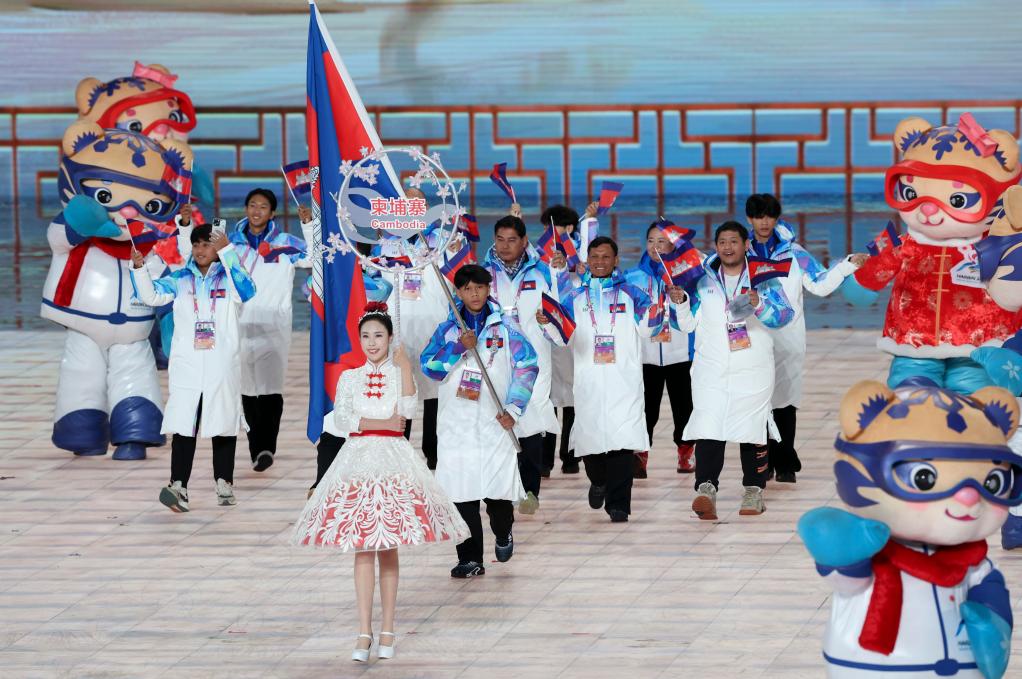 2月7日,柬埔寨代表团在哈尔滨亚冬会开幕式上入场。新华社记者 杨磊 摄