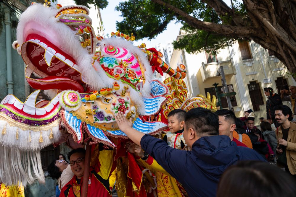 1月29日,舞龙队伍在澳门风顺堂区与市民互动。新华社发(张金加摄)