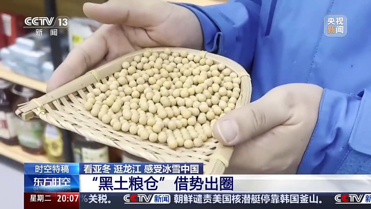 总台央视记者郑怡哲:大家可以看到我手上拿的就是黑龙江当地产的大豆,它的种植面积和产量都是全国第一。单从种植面积上来讲,黑龙江大豆的种植面积占全国的60%左右。