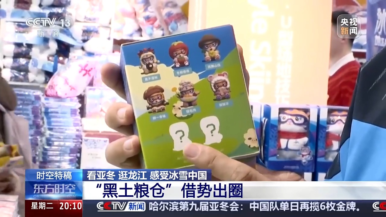 总台央视记者郑怡哲:吃饱了,喝足了,我们再来逛逛今年的亚冬会纪念品商店。我们注意到,有一个东北美食主题系列盲盒,有黑不溜秋的冻梨、冻柿子、小鸡炖蘑菇,还有红肠、锅包肉和雪糕。但是这里,我们可以看到还有两个隐藏款。