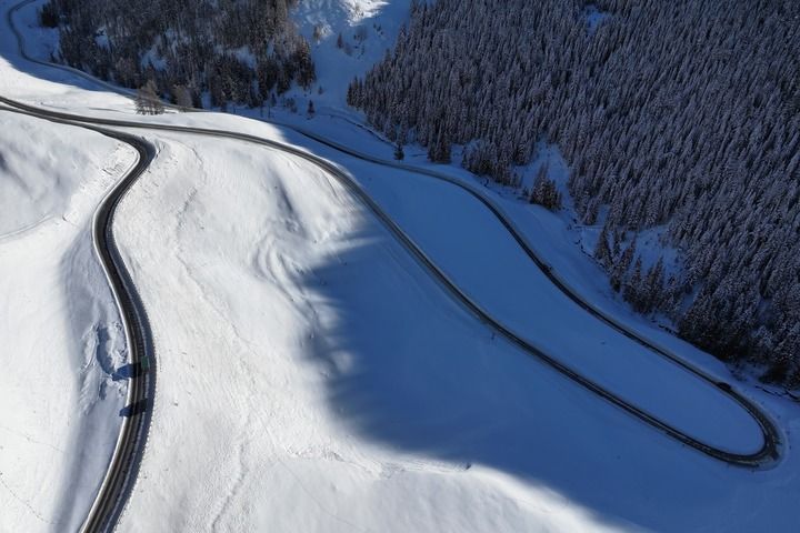 木哈买提别克·木哈买提哈力前往禾木送邮件的路上,经过多个弯道。从布尔津前往禾木的邮路弯道众多,冬季这里雪崩频发,路况危险(1月6日摄,无人机照片)。新华社发(加尔恒 摄)
