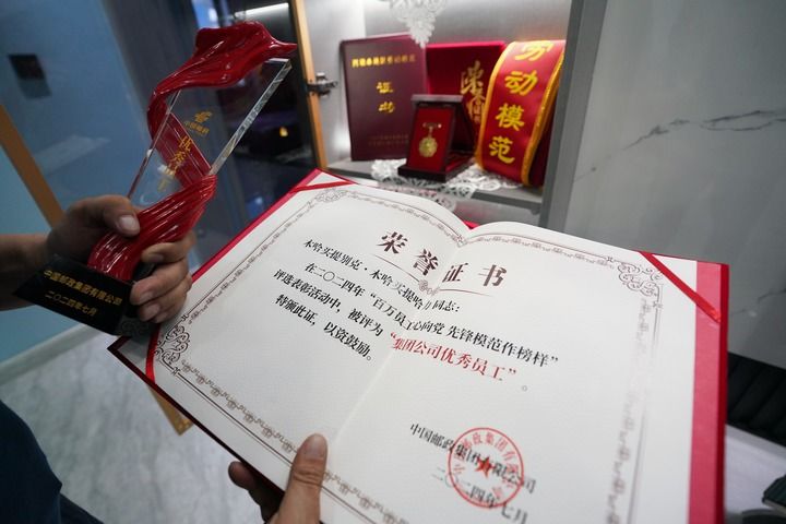 木哈买提别克·木哈买提哈力向记者展示中国邮政集团有限公司颁发给他的“集团公司优秀员工”证书(1月9日摄)。新华每日电讯记者 阿曼 摄