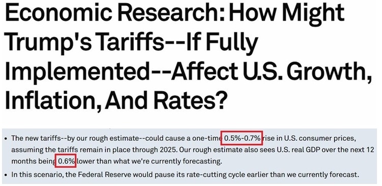 根据标普全球的最新估计,新关税可能会导致美国消费者价格指数(CPI)一次性上涨0.5%-0.7%,未来12个月美国实际国内生产总值(GDP)将比目前的预测值低0.6%。