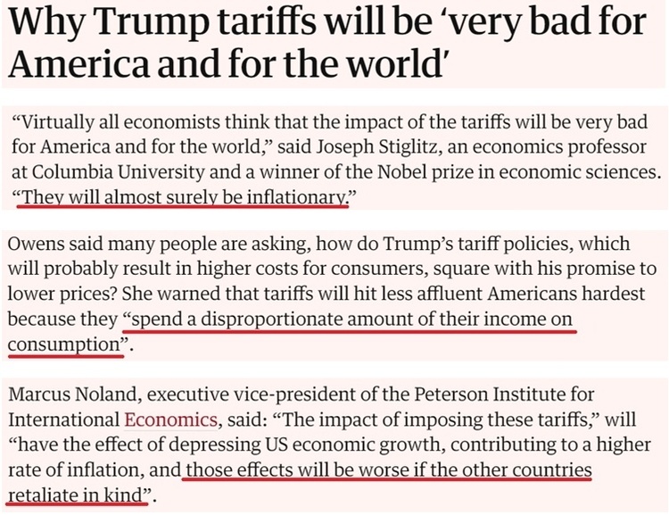 文章援引美国哥伦比亚大学经济学教授、诺贝尔经济学奖得主约瑟夫·斯蒂格利茨的话强调,“几乎所有经济学家都认为,关税将对美国和世界非常不利”,“它们几乎肯定会导致通胀”。
