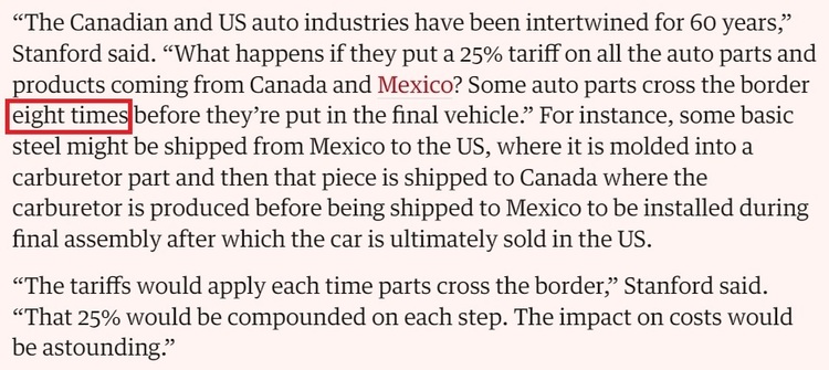 “一些汽车零部件在被最后装入一辆汽车之前要穿越边境8次,如果美国对来自邻国的所有汽车零部件征收25%的关税,这些关税将在零部件每次越过边境时都生效,最终对成本的影响将是惊人的。”