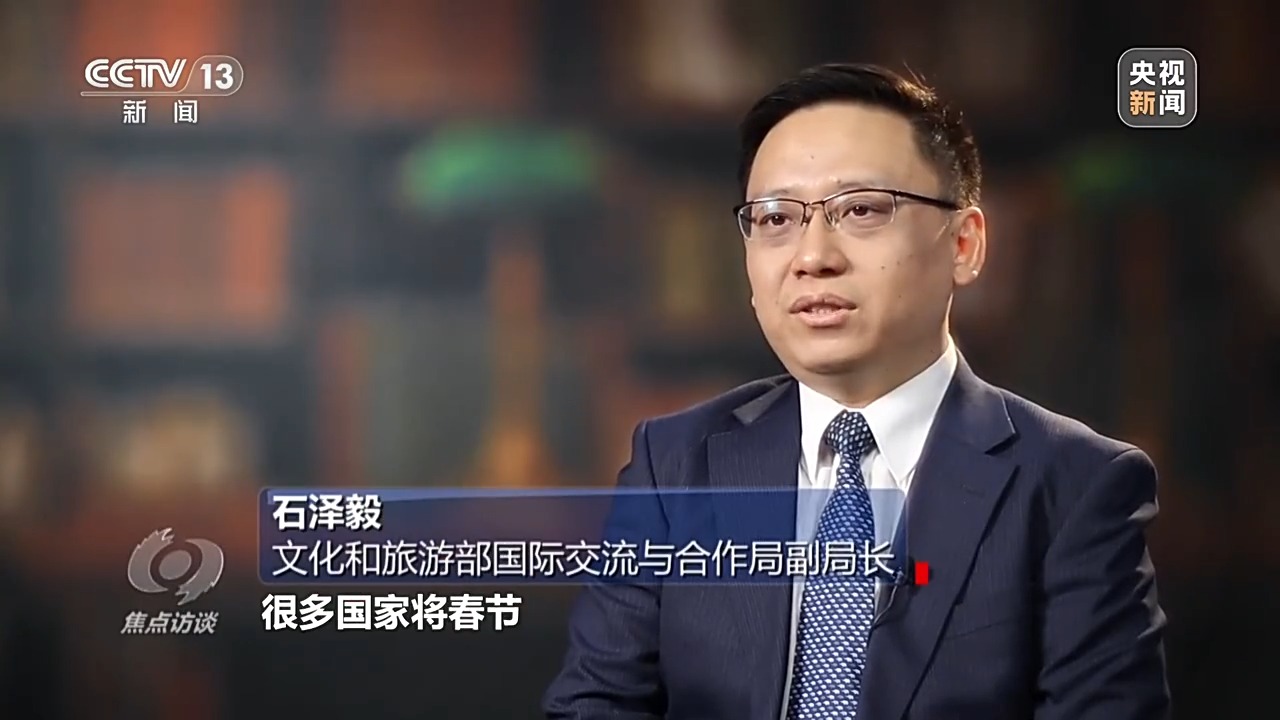 文化和旅游部国际交流与合作局副局长石泽毅:春节文化在全球广泛传播,为世界各国人民近距离感知中华文化打开了一扇窗,也为促进中外民众相知相亲、不同文明和合共生架起了一座桥。