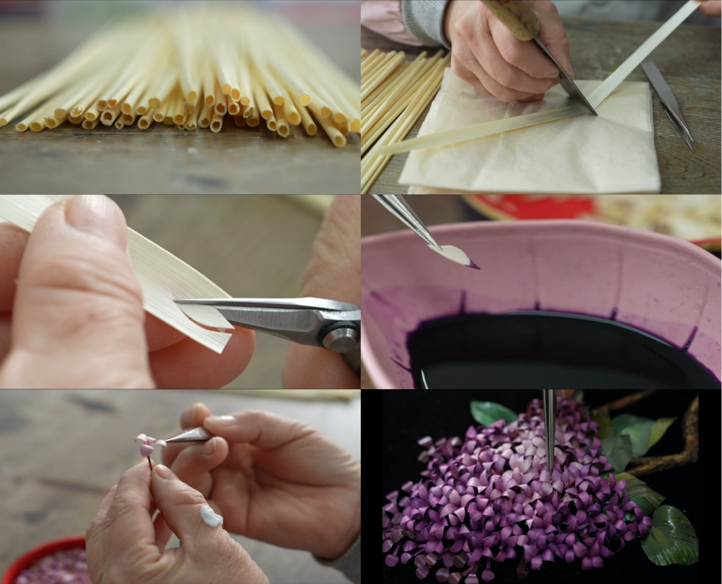 国家级工美艺术大师马文侠女士介绍说,制作这幅《清香满人间》采用的是当地一种名叫“麦秆剪贴”的非遗技艺。它完全是依靠手工制作,过程极其复杂繁琐:“用的小麦秆要选小麦的第二节和第三节,然后经过泡、煮、染、刮、剪、编、雕、印、熨、烫、烙、粘贴等十几道程序才能做成。”