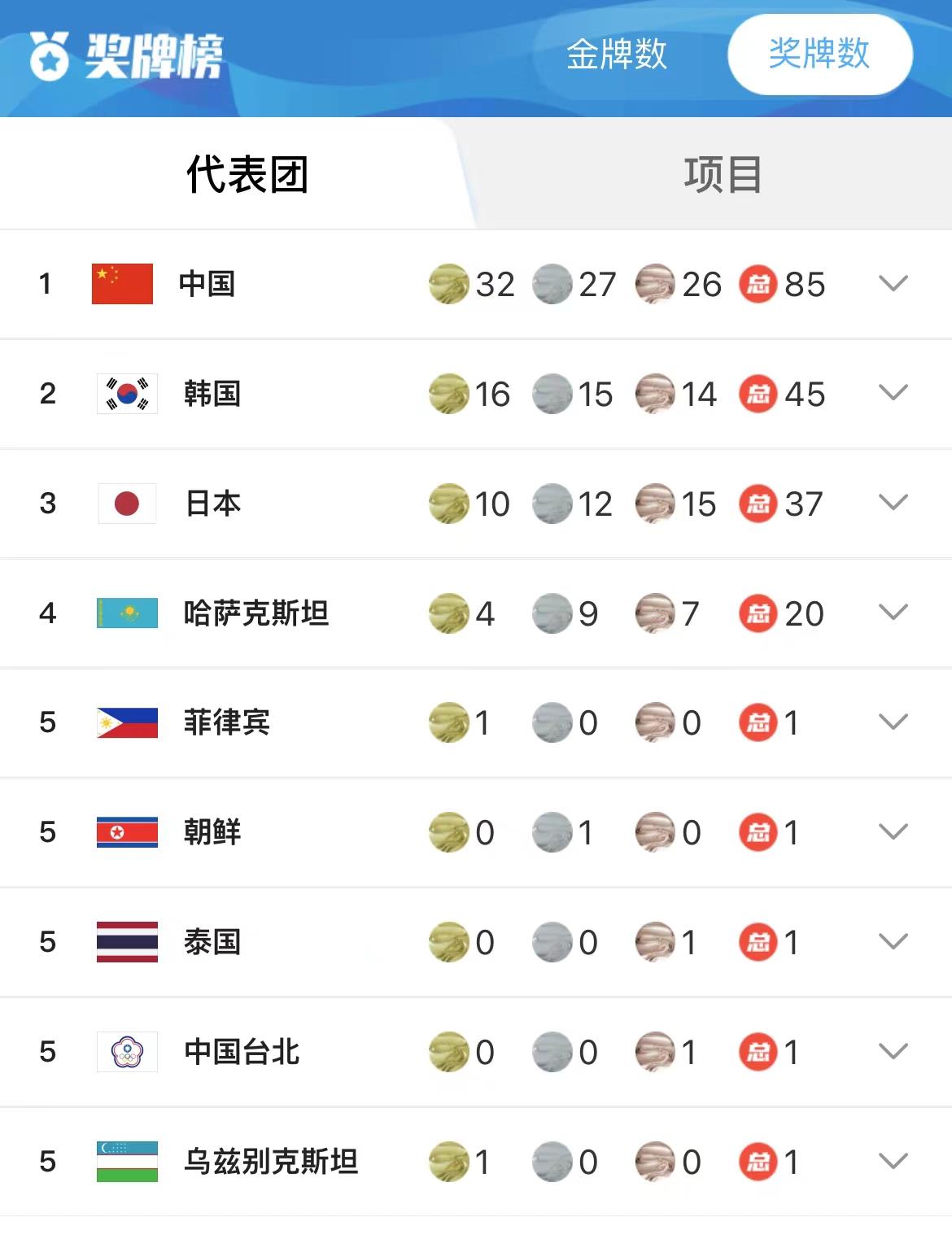 中国体育代表团收获32金、27银、26铜共计85枚奖牌,位列本届亚冬会金牌榜和奖牌榜首位,创造亚冬会历史参赛最好成绩。
