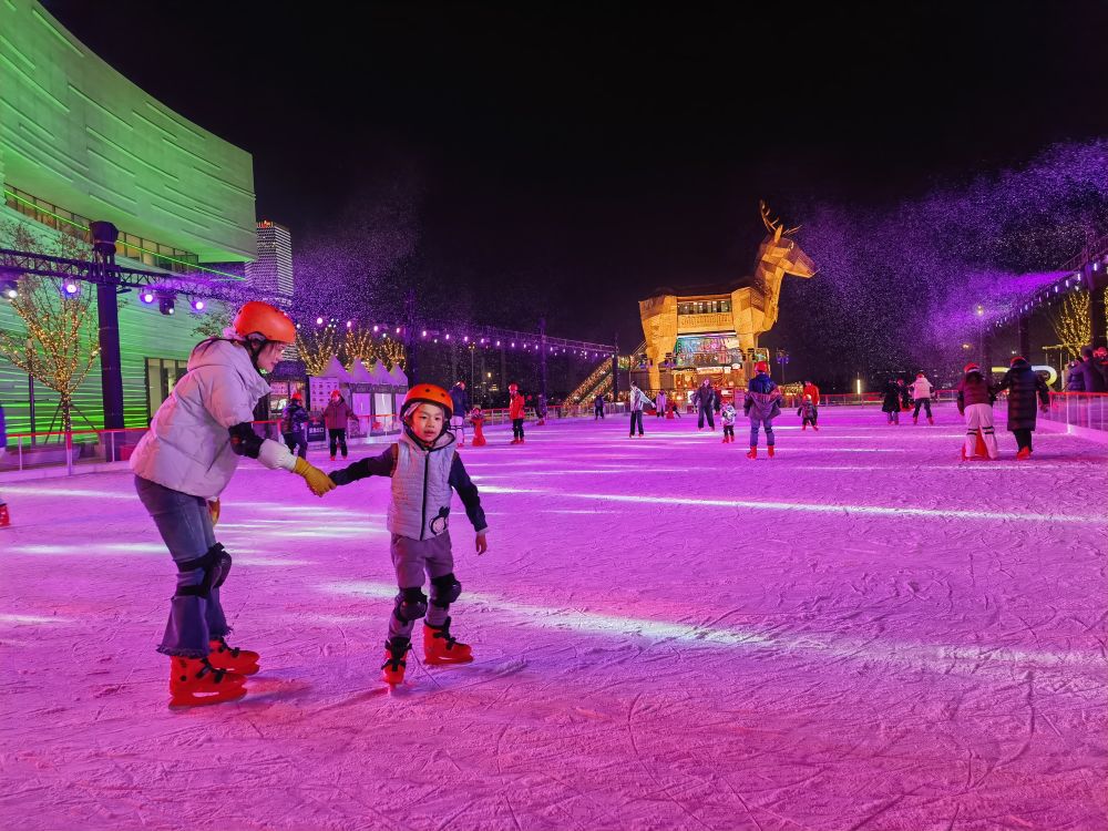 新华社上海2月14日电(记者陈爱平)在上海徐汇滨江,“乐滑之梦”和西岸梦中心联手打造的户外水岸冰场热闹非凡。伴随节奏感强的音乐和灵动灯光,上海市民周雄和儿子手牵手,在冰面上练习滑行。