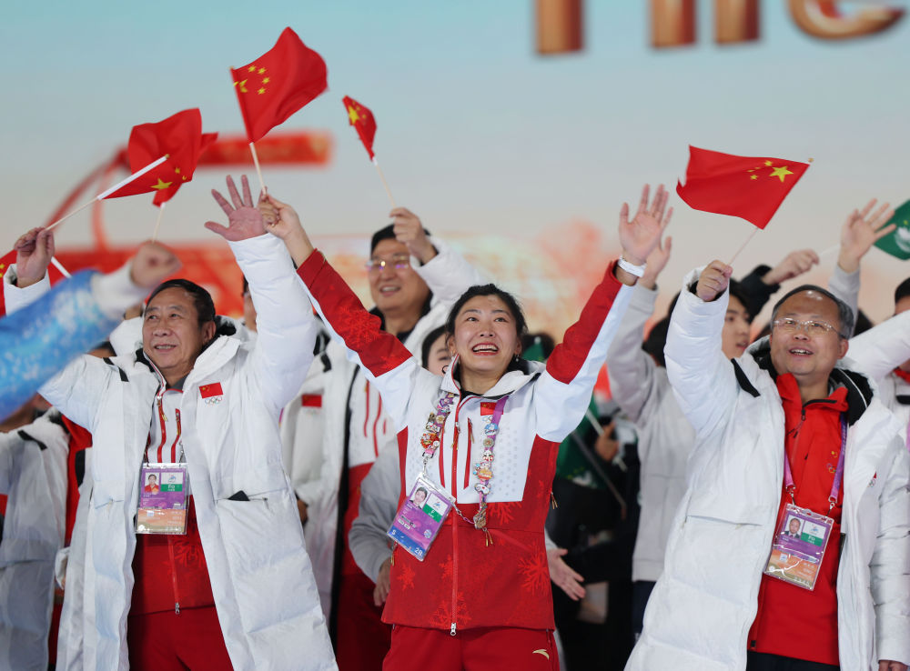 2月14日,中国体育代表团旗手徐梦桃(中)在亚冬会闭幕式上。新华社记者 张涛 摄