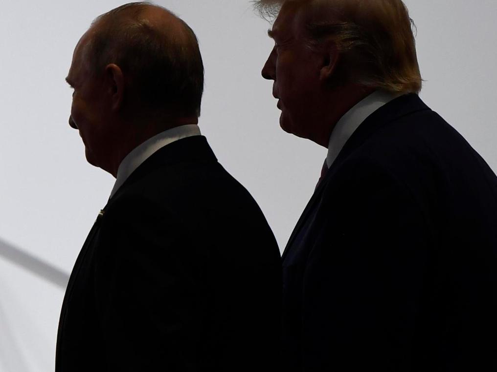 这是2019年6月28日在日本大阪拍摄的参加G20峰会的美国总统特朗普(右)和俄罗斯总统普京。新华社/美联