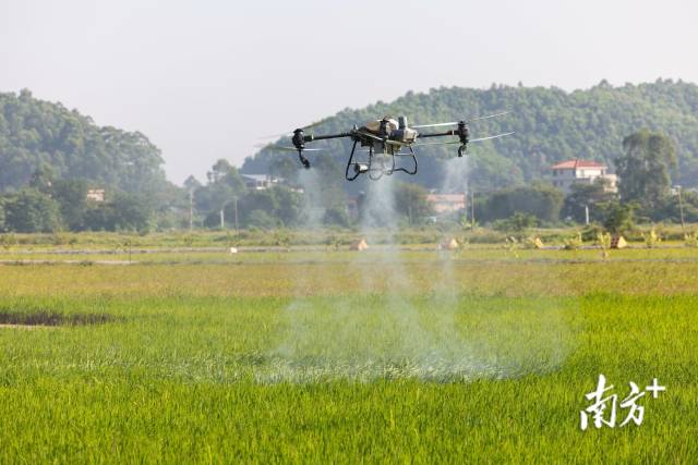 在佛山明城镇的“万亩稻田”,一人操控无人机一日作业就可以完成200到300亩,效率是人工的10倍。南方+记者 戴嘉信 摄
