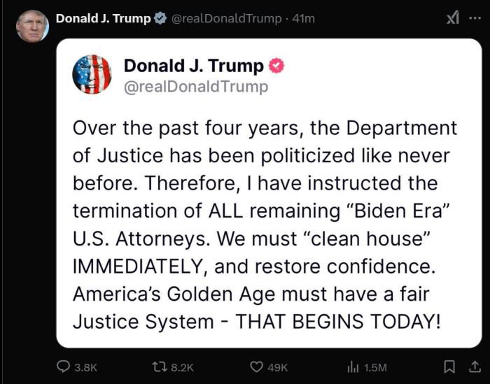 特朗普说,“过去四年,美国司法部的政治化达到了前所未有的程度。因此我已下令解雇所有‘拜登时代’联邦检察官。”
