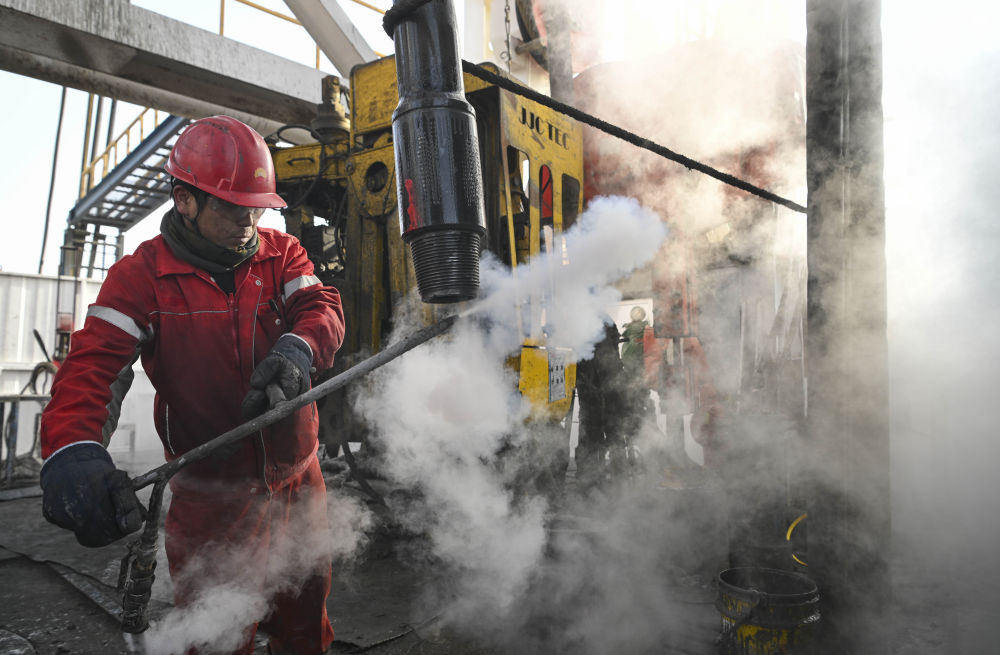 2025年2月19日,工人在中国石油塔里木油田深地塔科1井上施工。新华社记者 胡虎虎 摄
