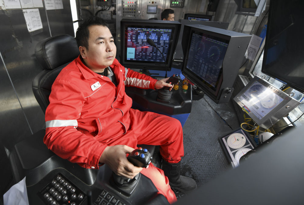 2025年2月19日,司钻在中国石油塔里木油田深地塔科1井上操作设备。新华社记者 胡虎虎 摄