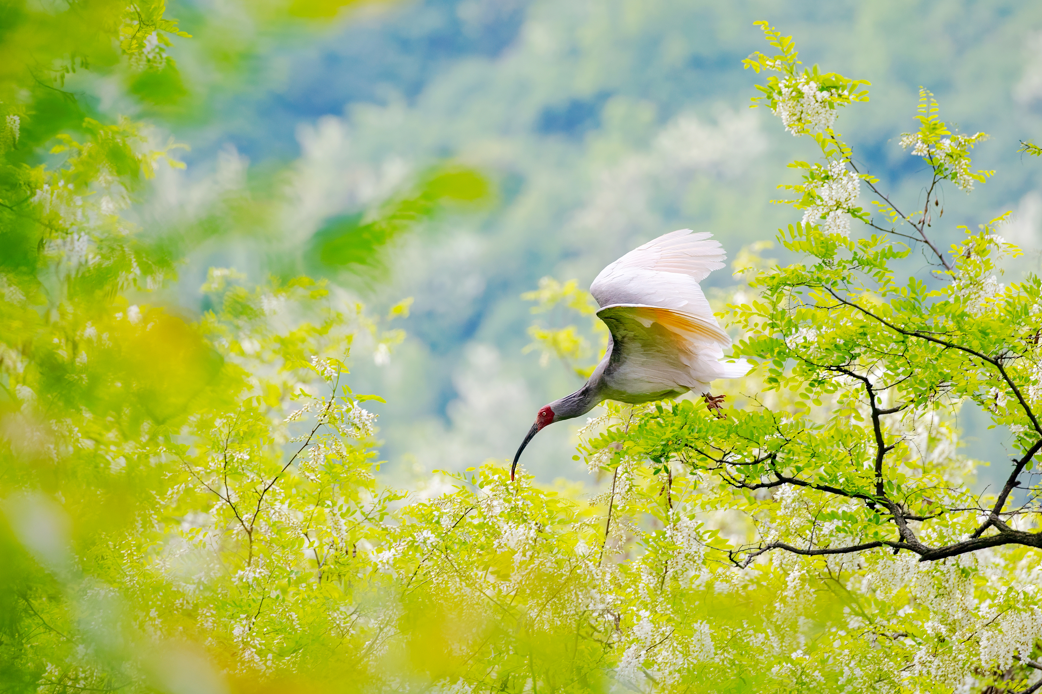 2024年5月2日,一只秦岭以北野放朱鹮在陕西省铜川市耀州区沮河上游洋槐林中飞翔。