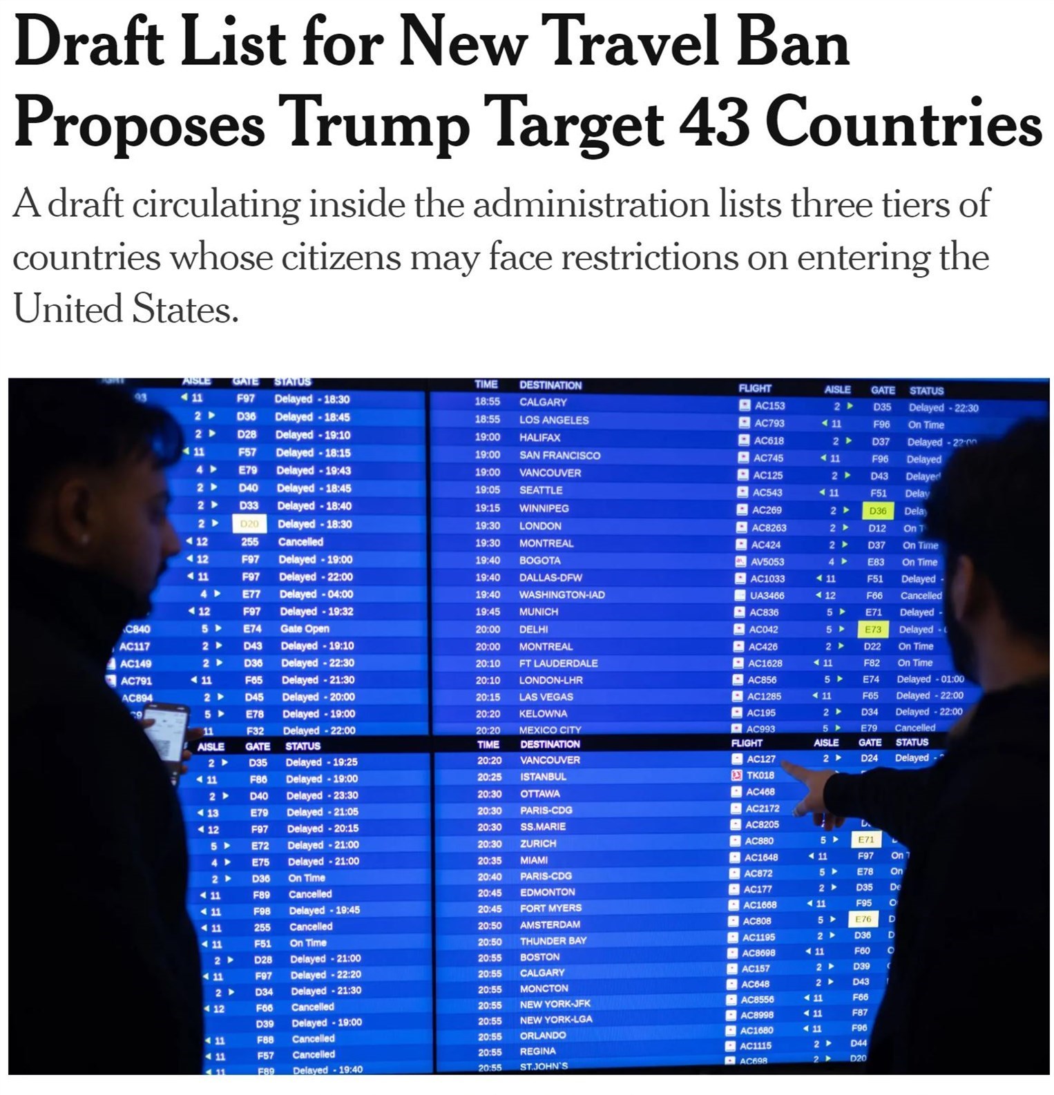 ●据美媒报道,特朗普政府正在考虑对几十个国家的公民实施旅行签证限制。