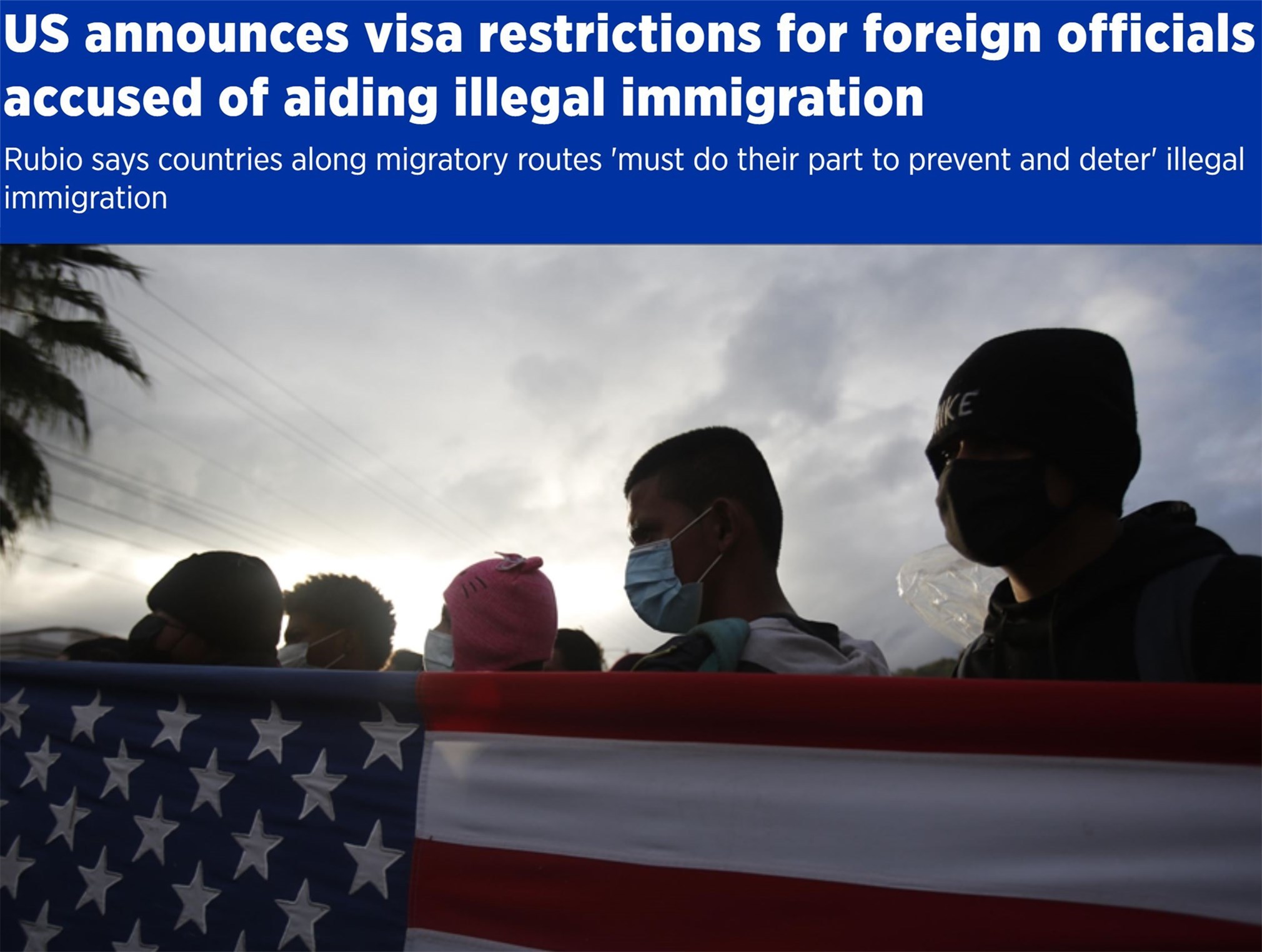 ●美国国务卿鲁比奥本月初发表声明,宣布针对外国官员及其他“协助非法移民进入美国”的人员实施签证限制。