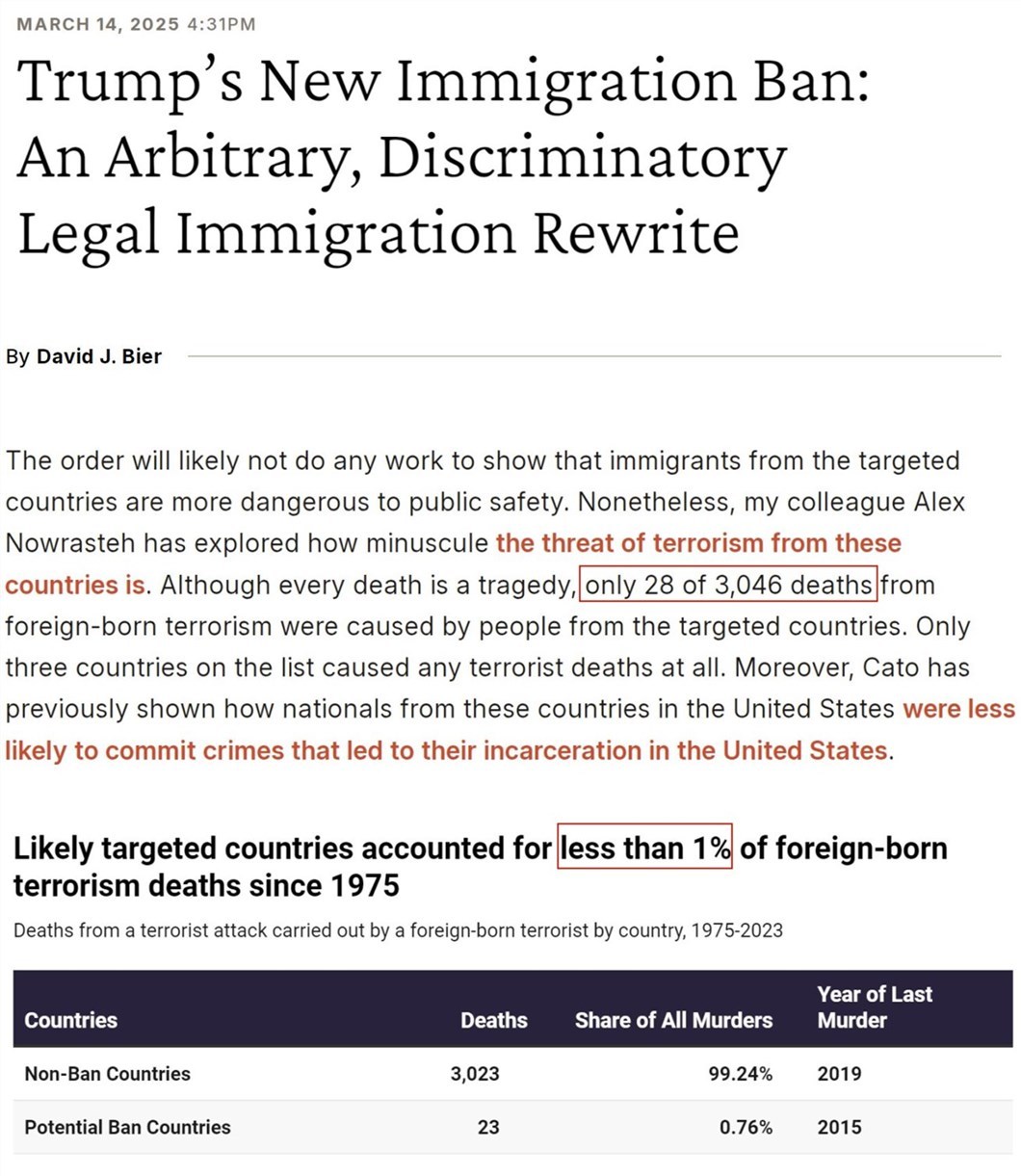 根据该报告,1975到2023年间,在3046名死于外国出生的恐怖分子之手的美国人中,只有28人的死亡是由来自特朗普计划限制的“目标国家”的人所造成的,占比不足1%。